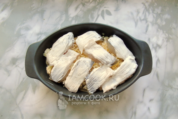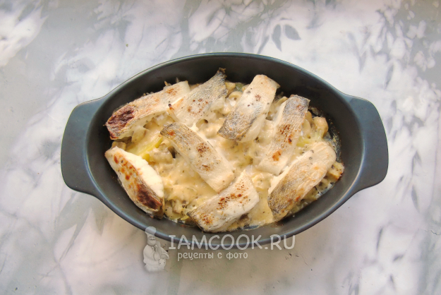 Филе судака нарежьте на порционные кусочки и выложите в форму для запекания. Смажьте приготовленной смесью.