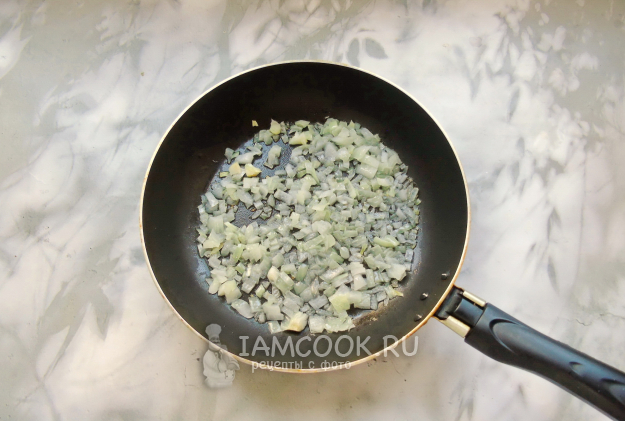 Репчатый лук очистите, помойте и мелко нарежьте. Поджарьте в сковороде на растительном масле до прозрачности.