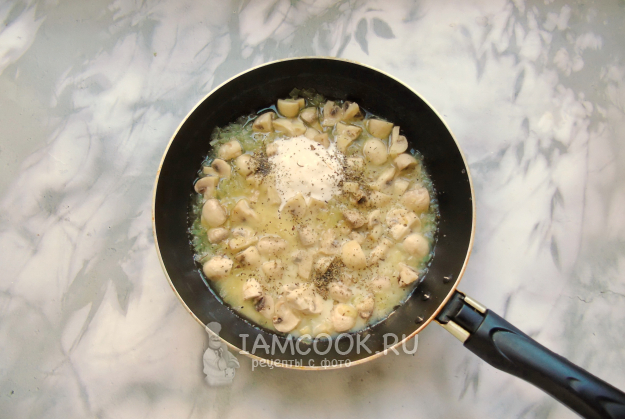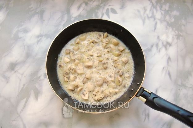 Жарьте грибы с луком 6-7 минут. Затем налейте сливки и добавьте сметану. Насыпьте крахмал. Посолите и поперчите. Перемешайте и прогрейте соус 3-4 минуты на небольшом огне.