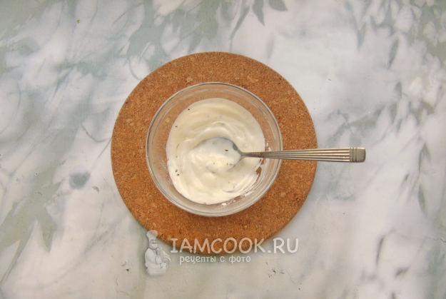 В мисочке перемешайте 2 столовые ложки сметаны, 1 столовую ложку растительного масла, соль и перец черный молотый.