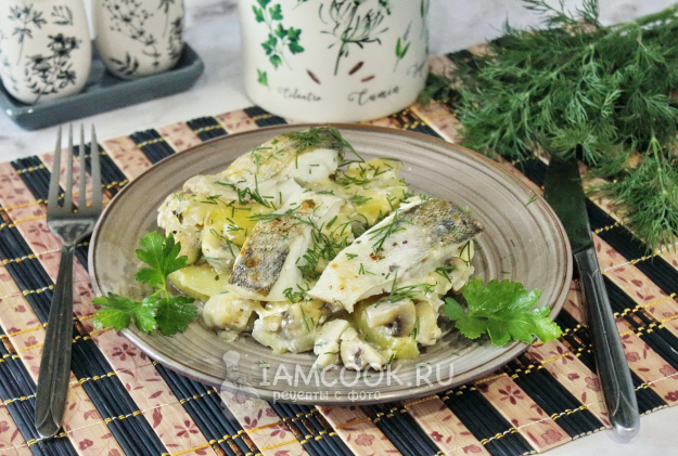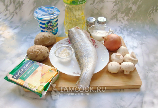 Соберите ингредиенты для приготовления судака «Нельсон» (с картошкой и грибами).