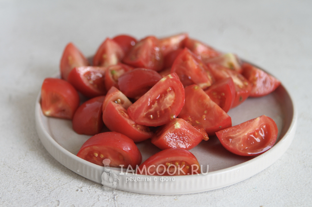 Подготовьте помидоры. Промойте и обсушите их. Нарежьте на 4 части.