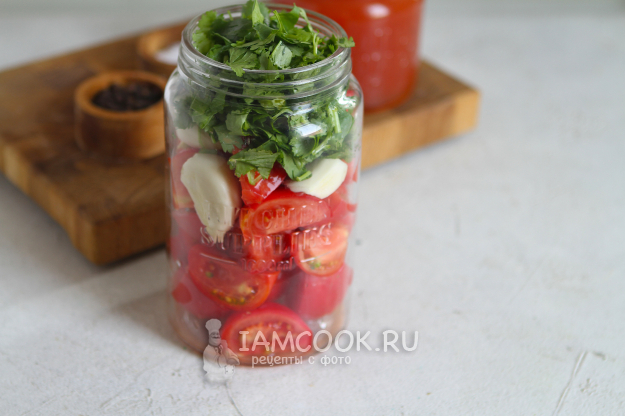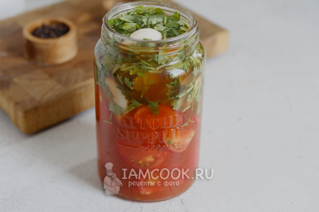 В банку переложите помидоры, чеснок и кинзу.