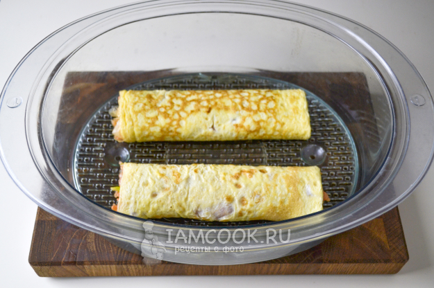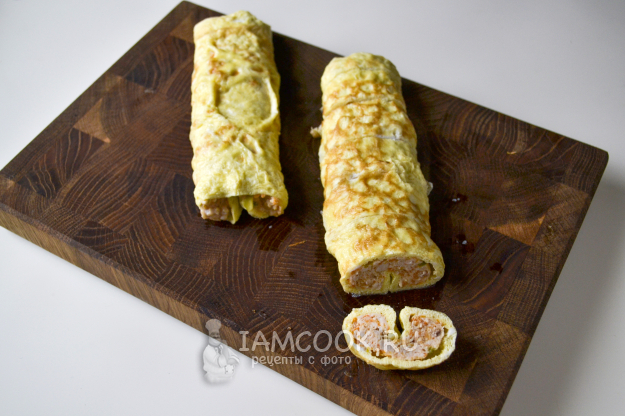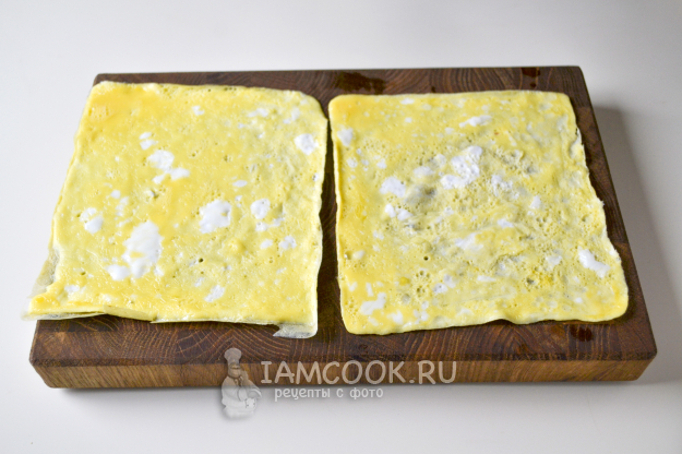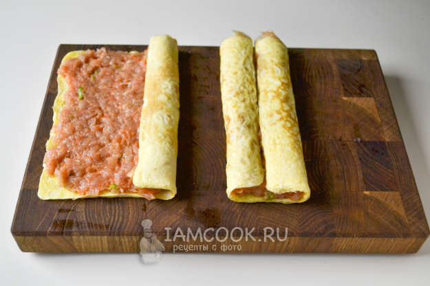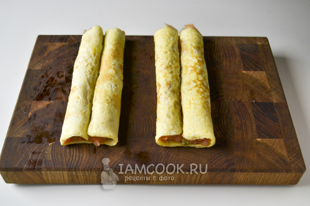 Затем второй край блина также сверните до середины. Получается два яичных рулетика.