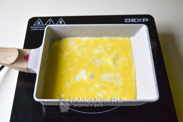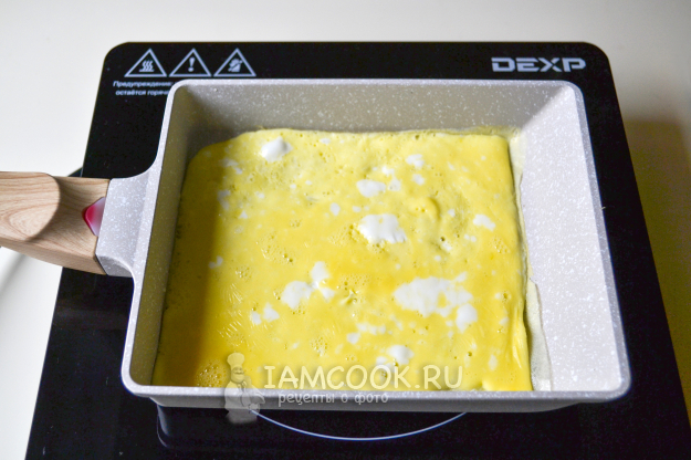 Смажьте сковороду растительным маслом. Разогрейте сковороду и влейте яичную смесь тонким слоем.