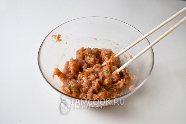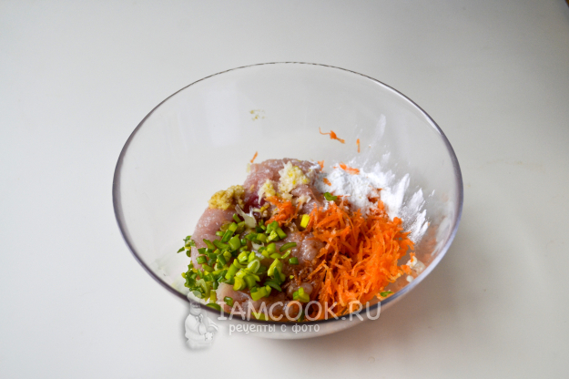 Для начинки положите в миску фарш, натрите на мелкой терке морковь, зеленый лук, натертый на мелкой терке имбирь, соевый соус и кукурузный крахмал. Соль - по вкусу. Если соевый соус очень соленый, то соль можно и не добавлять.