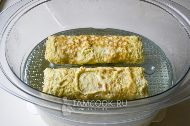 Готовьте рулетики на пару в течение 20-22 минут. Во время приготовления на пару яичная оболочка станет заметно пышнее, но потом опадет - это нормально.