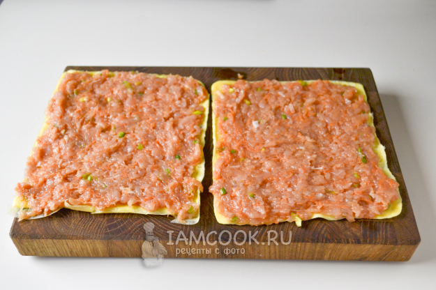 Разложите фарш на яичные блины слоем 4-5 мм.