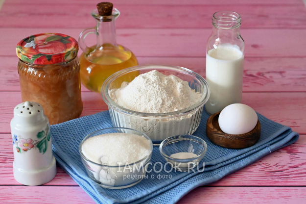 Вот такой набор продуктов потребуется для приготовления песочного пирога на кефире с вареньем.