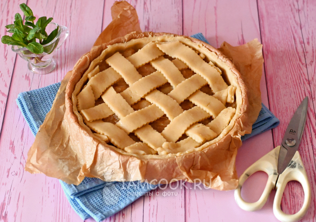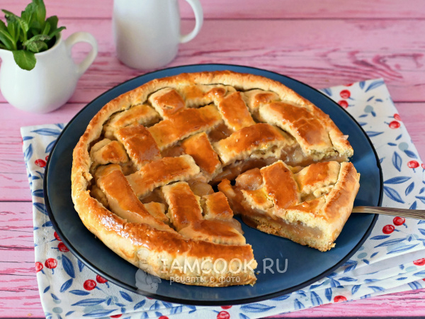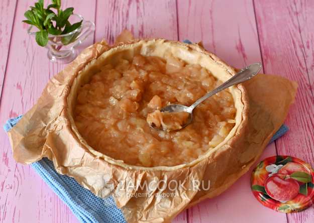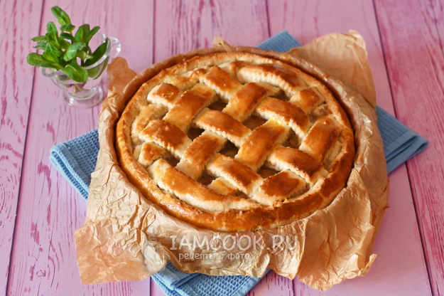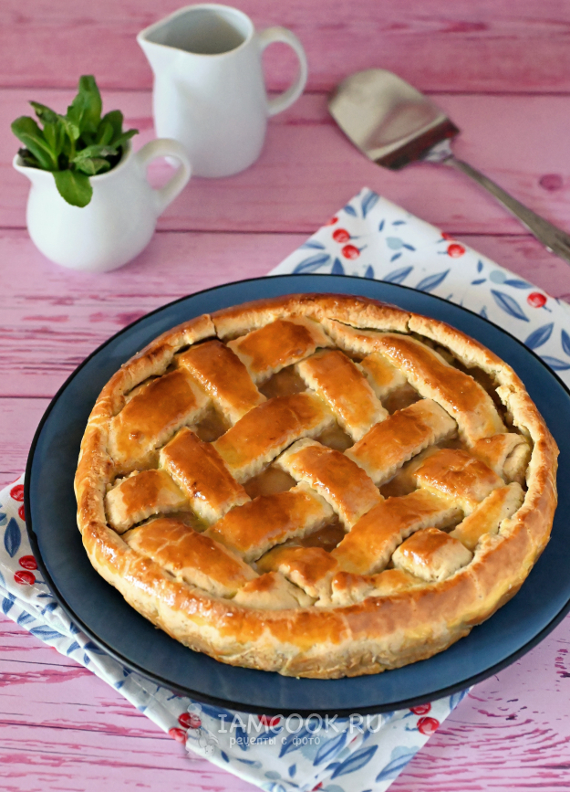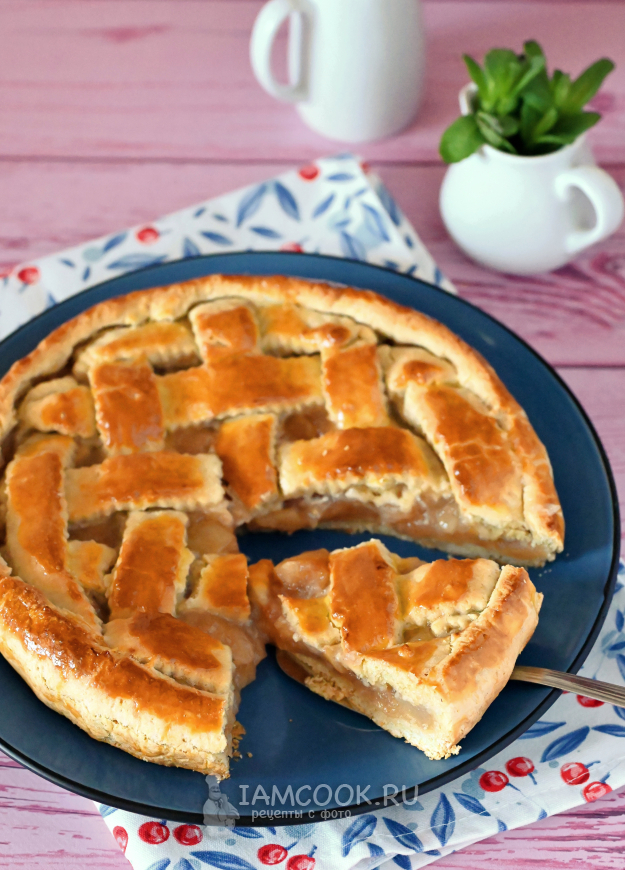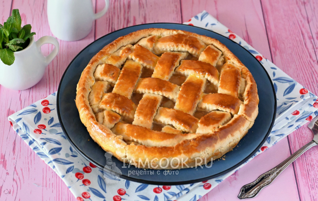 Как я упомянула в предисловии, в рецепте пирога было указано, что начинка любая. Но имеется в виду сладкая начинка, так как тесто всё же содержит достаточное количество сахара. Из моего опыта, этот пирог хорош с творожной начинкой, с варёной сгущёнкой, со свежими яблоками, ягодами или ревенем, щавелем. Но чаще всего, и тогда, и сейчас, я его пеку с вареньем или джемом. Летом заготавливаю специально яблочное варенье для пирогов из дачных яблок.