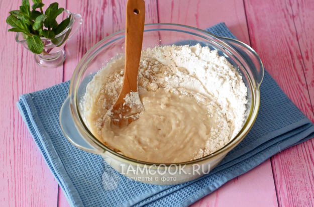В получившуюся массу всыпаем соду и постепенно вводим муку, начиная замешивать тесто ложкой.