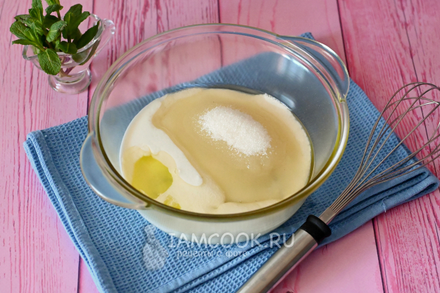 В миску вливаем кефир, добавляем растительное масло, соль, сахар и яичный белок.