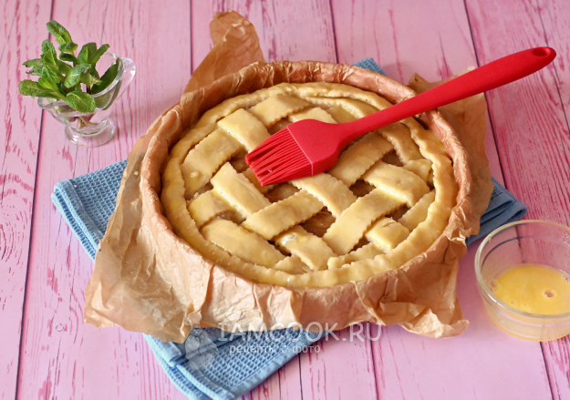 Бортики пирога аккуратно загните внутрь при помощи вилки. Смажьте верх пирога желтком.