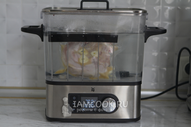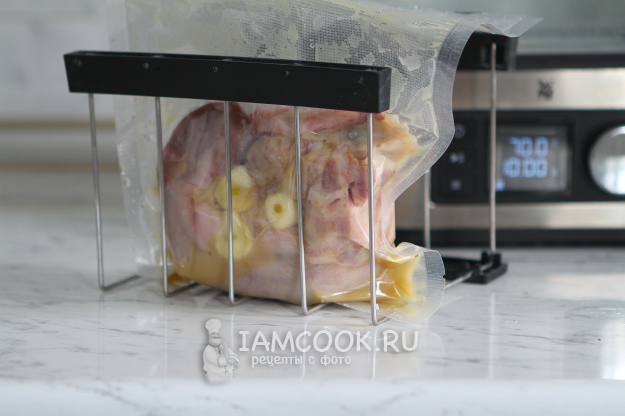 Нагрейте воду до температуры 70 градусов. Когда вода нагреется до нужной температуры, опустите пакет с языком в воду и готовьте 10 часов.