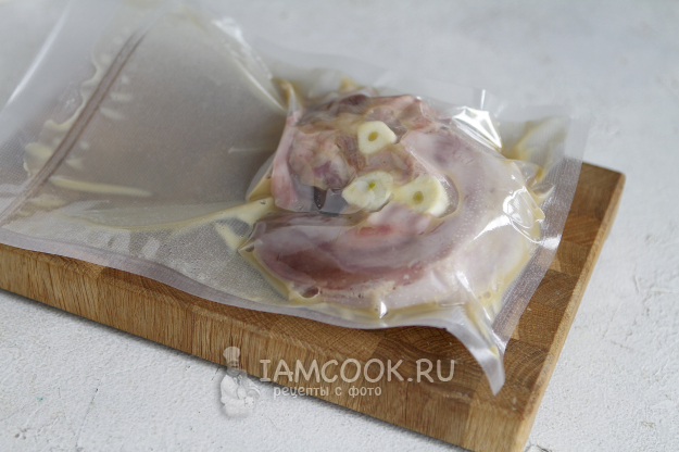 Почистите чеснок. Язык переложите в пакет для вакуумации вместе с дольками чеснока и и завакуумируйте, откачав из пакета лишний воздух.
