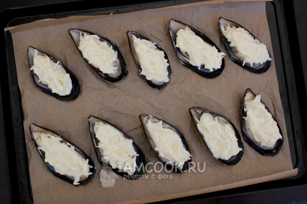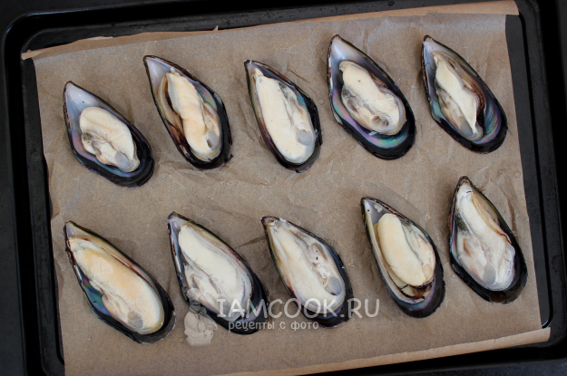 Размороженные мидии в створке ополосните, слейте с них всю жидкость. Уложите их на противень для запекания, можете проложить его фольгой или пекарской бумагой.