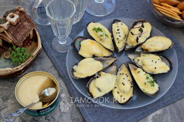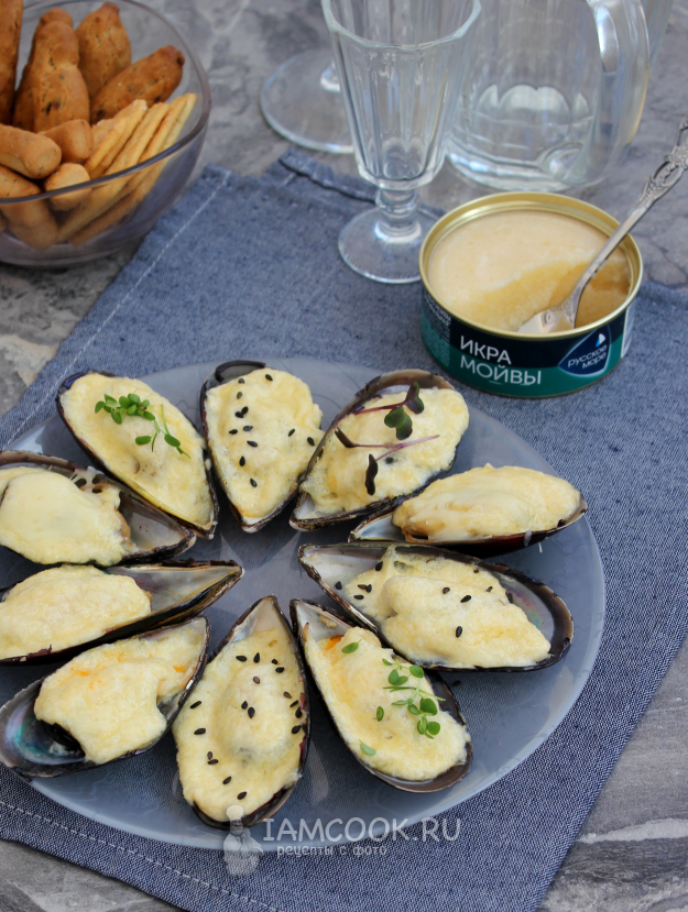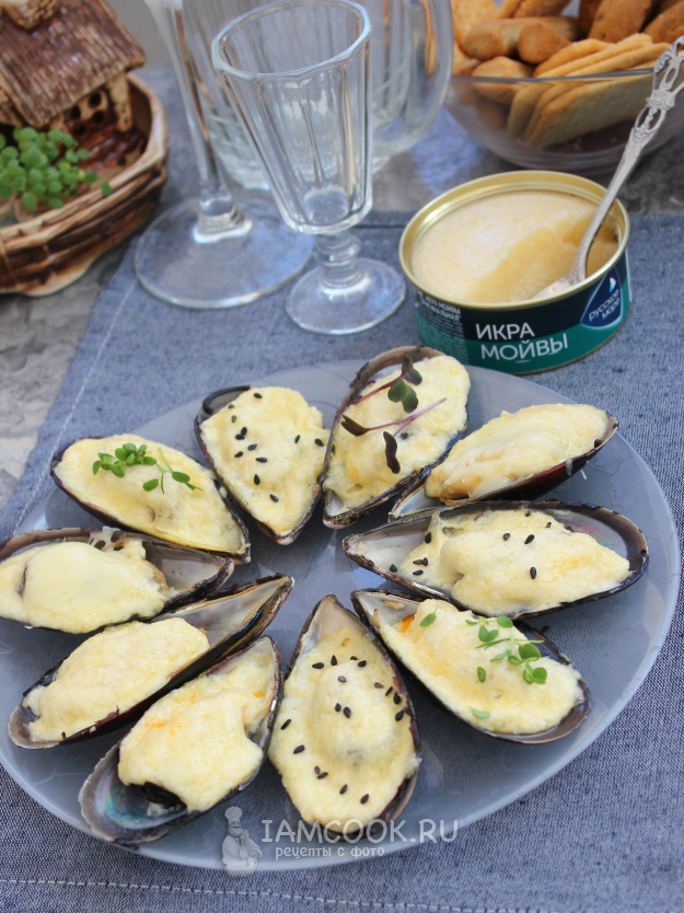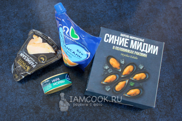 Ингредиенты для приготовления запеченных мидий в ракушках с икрой мойвы соберите по списку к рецепту. В идеале приобрести уже подготовленные, т.е. открытые и в одной створке мидии. Мне на днях (в 2026-м, в Анапе) попалась коробка 1 кг за 508 руб., и в ней 37 мидий. Сделала небольшую порцию с икрой мойвы, а остальные - в соусе блю чиз.