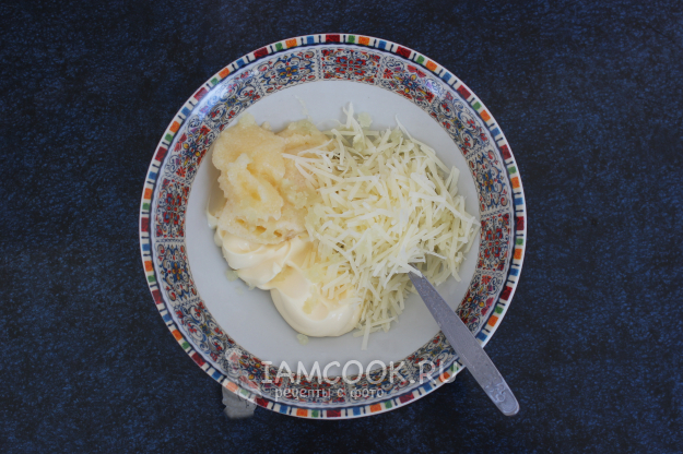 Для начинки соедините консервированную икру мойвы, мелко тёртый твердый сыр/пармезан, майонез и давленный в прессе или тёртый чеснок. Перемешайте.