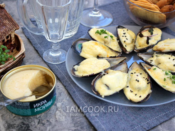 Запеченные мидии в ракушках с икрой мойвы можно сопроводить на выбор микрозеленью, кунжутом или капнуть острого масла по вкусу.