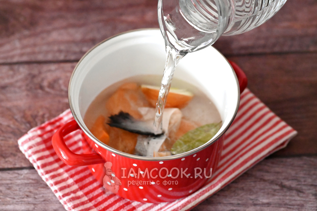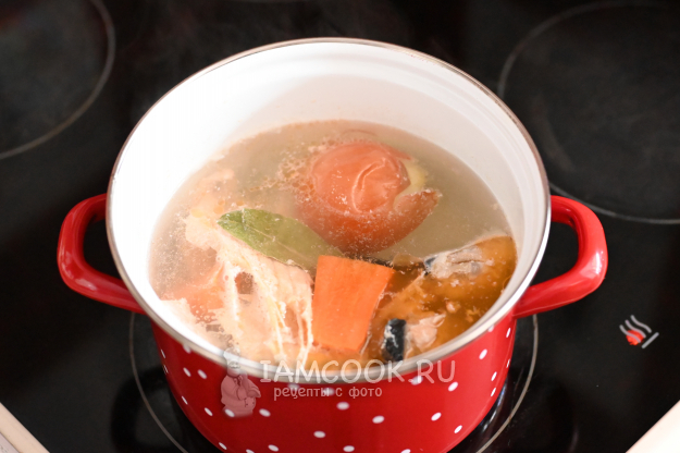 Доведите всё до кипения и тщательно снимите пену. Убавьте нагрев и варите рыбный бульон примерно 30-40 минут. Кастрюлю можно прикрыть крышкой.