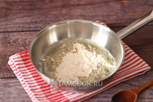 На среднем огне обжарьте муку до лёгкого кремового цвета. Постоянно помешивайте, чтобы мука не подгорела. Жарится она очень быстро, примерно 10-20 секунд.