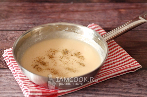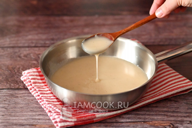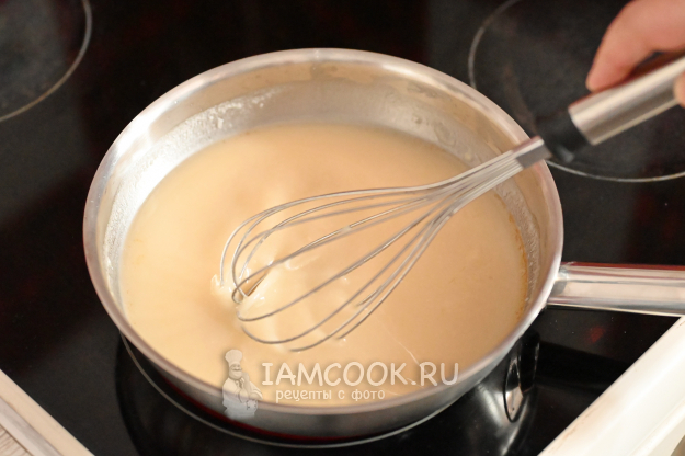 Верните сковороду на плиту и доведите соус до кипения. Проварите его 1-2 минуты до загустения. Непрерывно помешивайте венчиком, иначе соус подгорит.