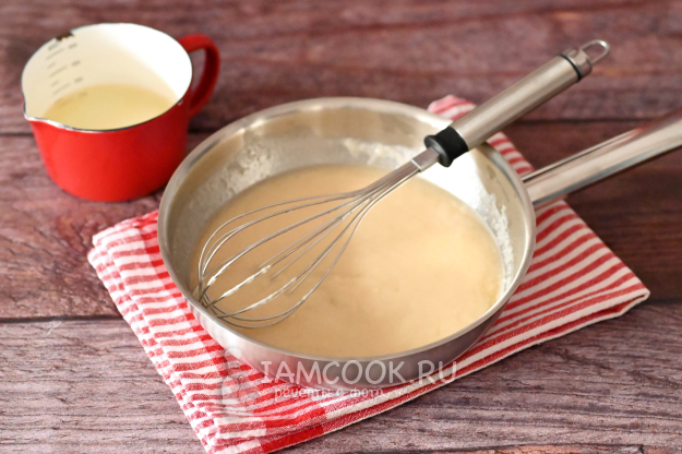 К обжаренной муке начните порциями вливать рыбный бульон и постоянно размешивайте венчиком, чтобы не образовались комки.