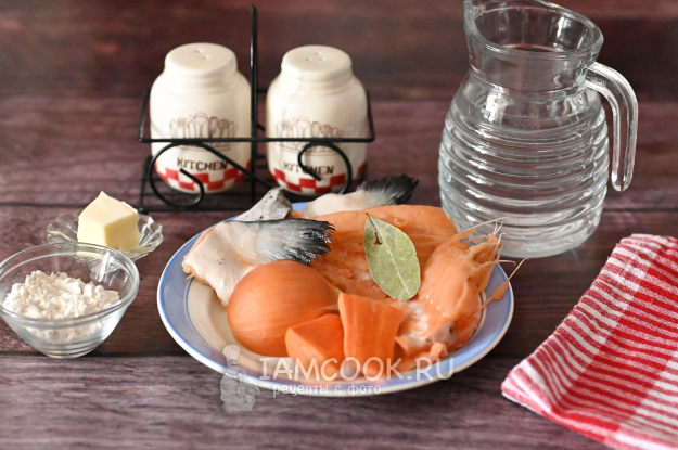 В кастрюлю сложите кости и плавники сёмги, добавьте половинку луковицы в шелухе, морковь и лавровый лист. Залейте водой и слегка подсолите.