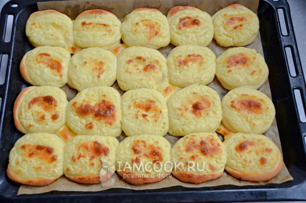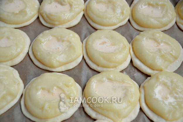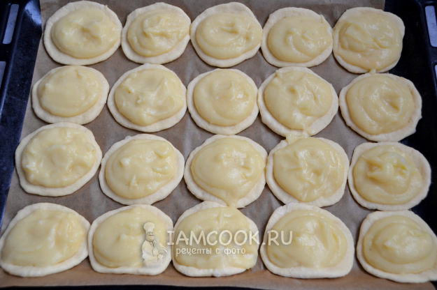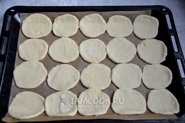 Выложите заготовки из теста на противень, застеленный бумагой для выпечки.