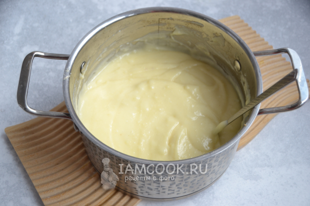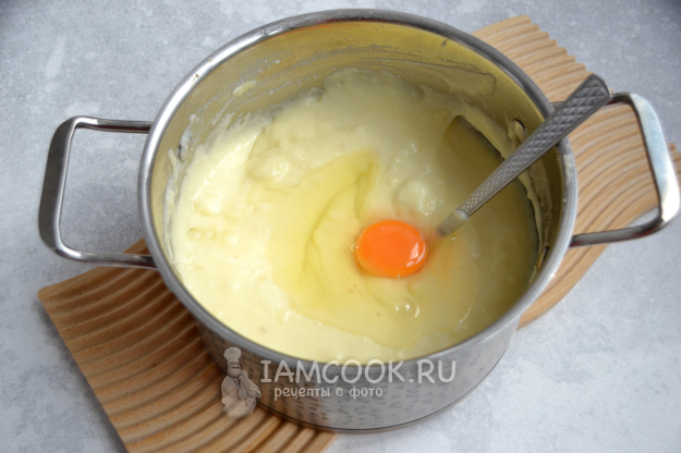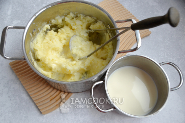 Разомните картофель толкушкой, разбавьте горячим молоком. Молоко должно быть непременно горячим, это важно, в противном случае картофельное пюре получится сероватого цвета. Пюре не должно быть слишком густым, но и не слишком жидким, консистенция пюре должна быть средней.