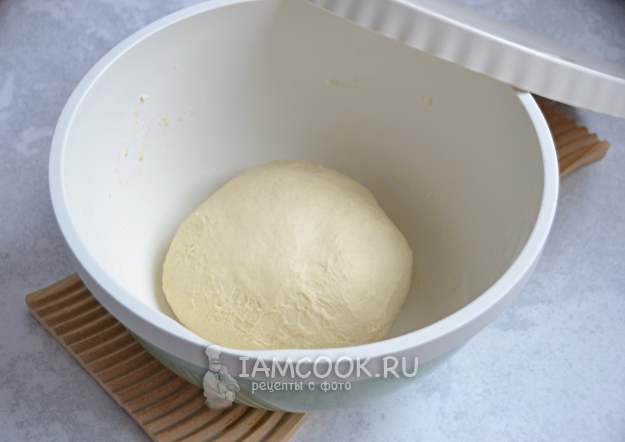 Руками или с помощью миксера замесите тесто, вымешивайте 5-7 минут, тесто должно быть мягким, эластичным, не липнущим к рукам. Округлите его в шар, накройте, поставьте в теплое место примерно на 1 час для подъема.