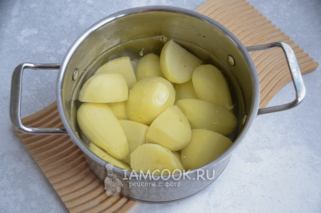 Пока тесто на расстойке, подготовьте начинку. Очистите картофель, залейте водой и отварите до полной готовности, не забудьте подсолить в конце варки.