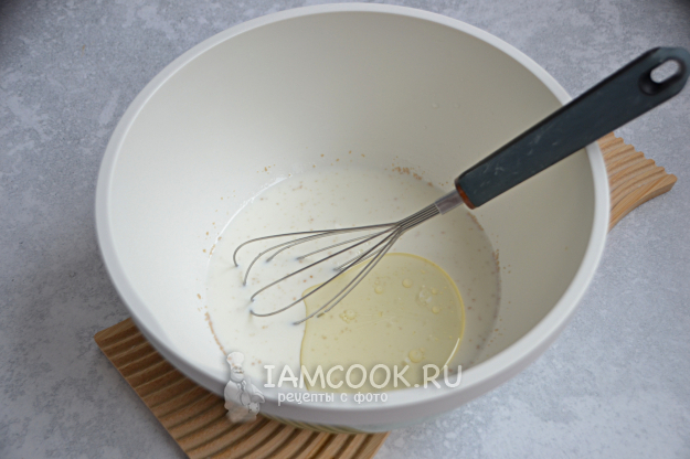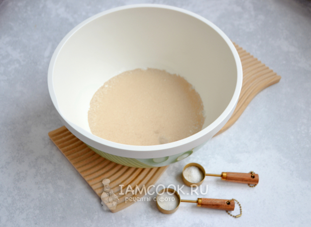 В миску для замешивания теста влейте теплое молоко, добавьте дрожжи, всыпьте соль и сахар, смешайте.