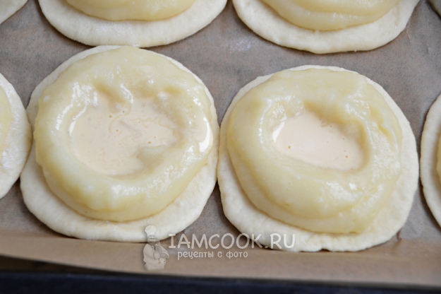 Чтобы заливка не стекала с начинки, чайной ложкой делайте небольшое углубление и вливайте заливку.