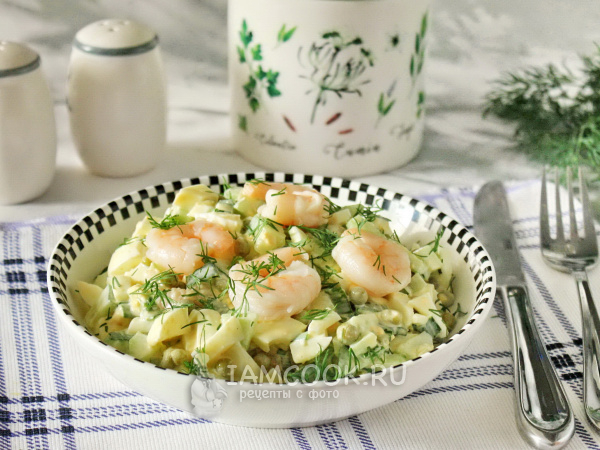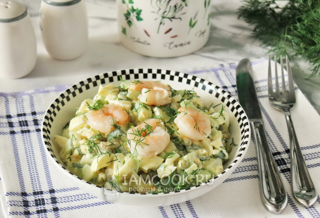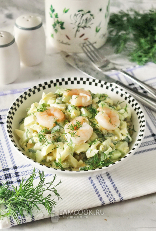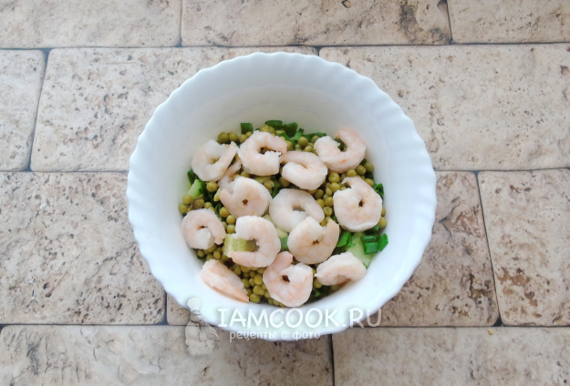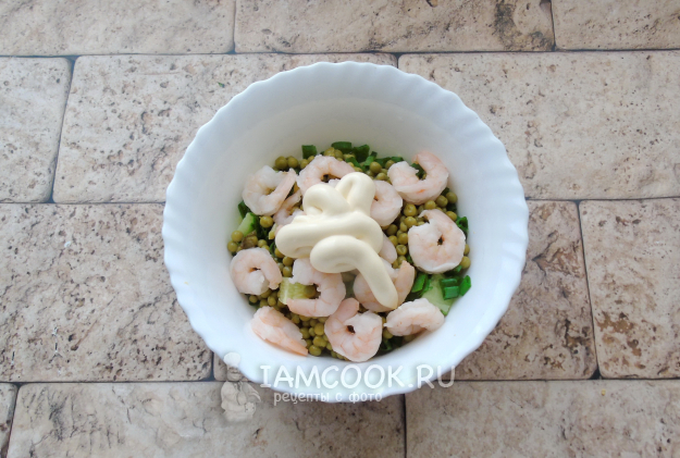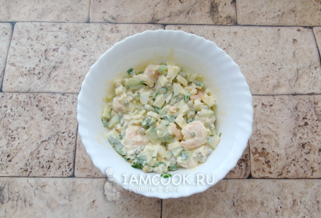 Заправьте салат майонезом или майонезом со сметаной. При желании посолите, учитывая, что в креветках, горошке и майонезе есть соль.