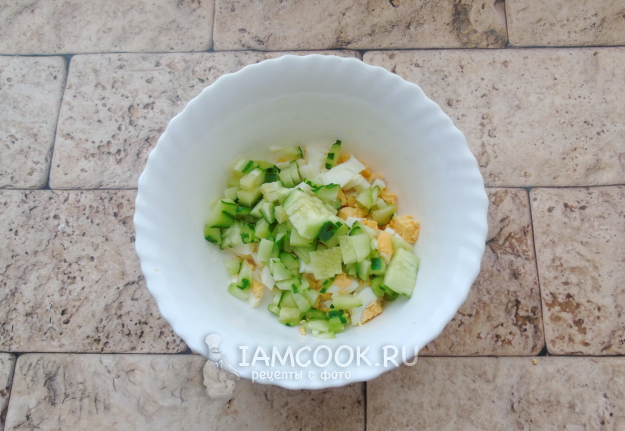 Огурец помойте и нарежьте кубиками. Если шкурка жесткая, то можно очистить.