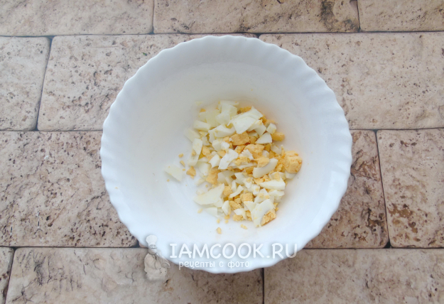 Яйца выложите в кастрюлю, залейте водой и варите 10 минут с момента закипания. После достаньте из кастрюли, обдайте холодной водой и охладите. Очистите и мелко нарежьте.