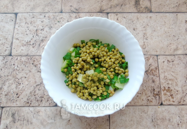 Выложите в салатник консервированный зеленый горошек.