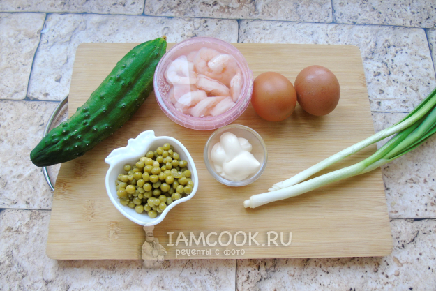 Соберите ингредиенты для приготовления салата с креветками и зеленым горошком.