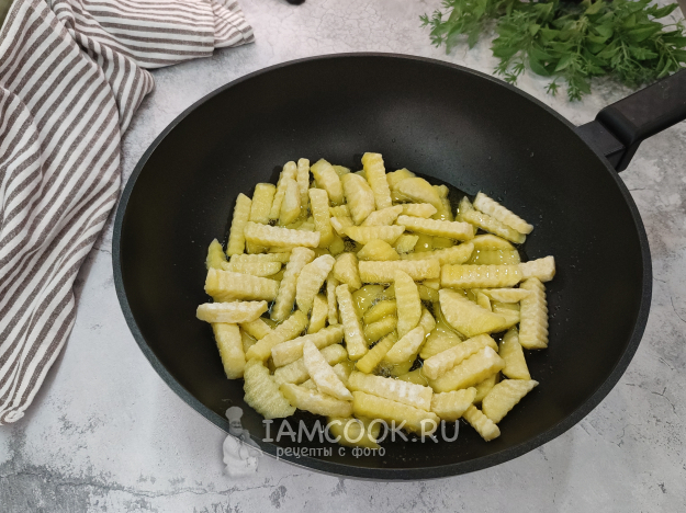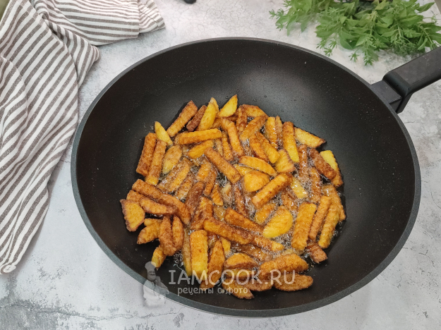 Китайцы такую картошку жарят (да часто и не только картофель, но и мясо, и рыбу) в большом количестве масла, так продукт готовится быстрее, равномернее, потом это масло они сливают и используют повторно. Мне, как русскому человеку, помнящему пирожки в столовых, обжаренных в масле не первой свежести, такая идея не нравится, но и выбрасывать столько масла мне мои дедовские еврейские корни не позволяют. Поэтому предлагаю жарить не во фритюре, а использовать необходимый минимум, т.е. масла взять столько, чтобы покрыло дно сковороды сантиметра на 2. Мне в мой вок диаметром 32 см понадобилось около 12 ст. л., вы смотрите по вашей сковороде. Выкладываем картофель, жарим на сильном огне, периодически перемешивая.
