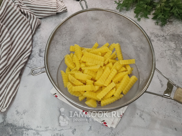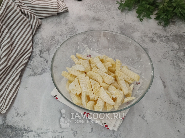 Картофель нарежьте брусочками или ломтиками, я воспользовалась фигурным ножом, просто для красоты 🥰. Картофель промойте, откиньте на сито, чтобы стекла лишняя влага. Желательно даже промокнуть его бумажным полотенцем.