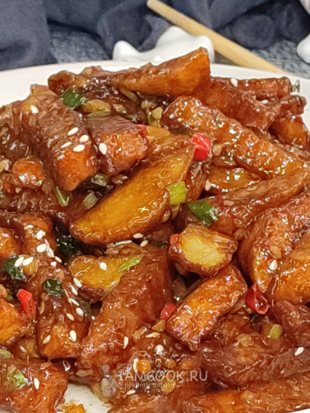 Вкуснейшая картошка в кисло-сладком соусе готова! Подавайте сразу, пока картошечка еще хрустящая, хотя, даже полежав в соусе и став мягче, она остается очень вкусной! По желанию можно украсить блюдо семенами кунжута, кинзой присыпать.
