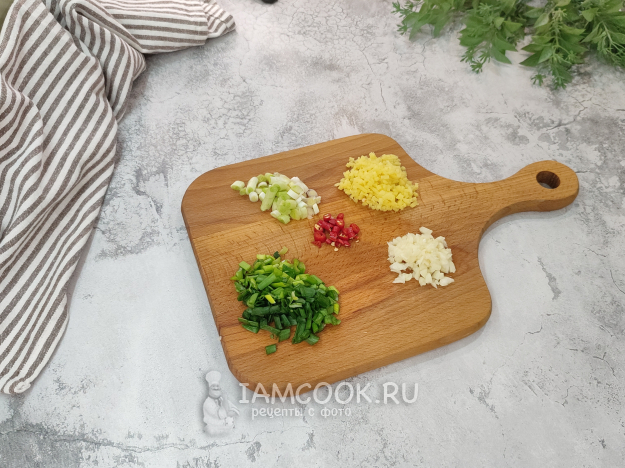 Сначала все подготовим. Овощи моем, чистим. Чили, имбирь, чеснок мелко нарежьте. Отдельно нарежьте белую и зеленую части зеленого лука.