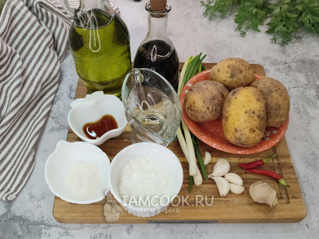 Соберите по списку ингредиенты для приготовления картошки в кисло-сладком соусе, они весьма просты. Количество картофеля берите, исходя из размеров вашей сковороды, при жарке картошке не должно быть тесно, она должна именно жариться, лучше приготовьте меньше, но вкуснее.