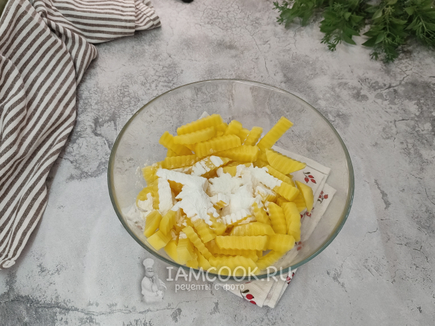Картофель переместите в глубокую миску, всыпьте крахмал.