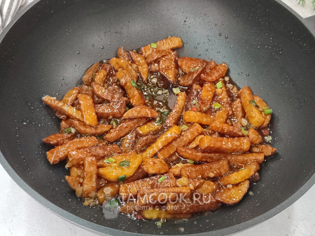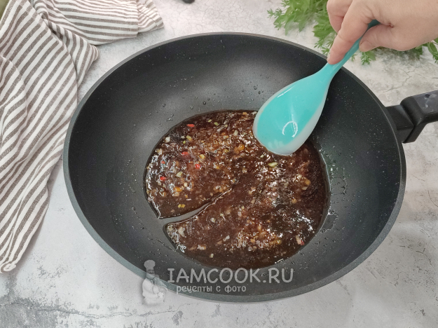 Подготовленный ранее соус снова перемешайте тщательно, т.к. крахмал осел на дно, и влейте соус в сковороду, огонь при этом можно убавить на средний. Проварите соус пару минут, он загустеет, станет блестящим, бархатистым.