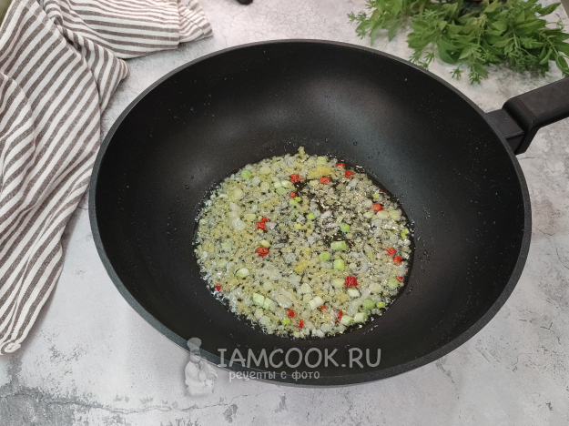 В сковороду отправляем имбирь, чили, чеснок, белую часть зеленого лука, обжариваем, постоянно помешивая, секунд 30.
