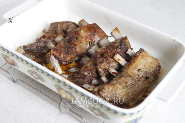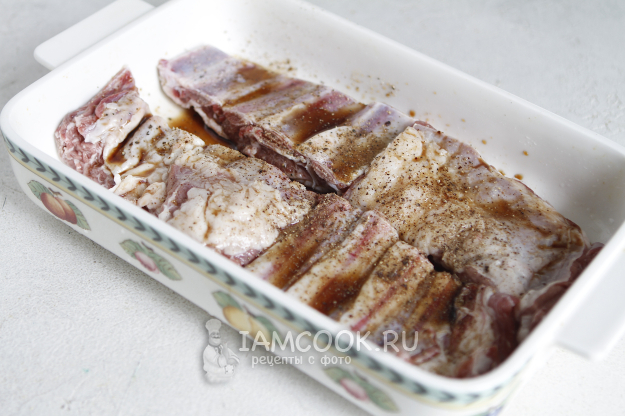 Что касается специй, то тут все зависит от ваших личных предпочтений. Я натерла ребрышки баранины солью, перцем и добавила совсем немного соевого соуса. Вместо него можно добавить кетчуп, горчицу. Все хорошо перемешала и оставила ребрышки на столе на 30 минут.
