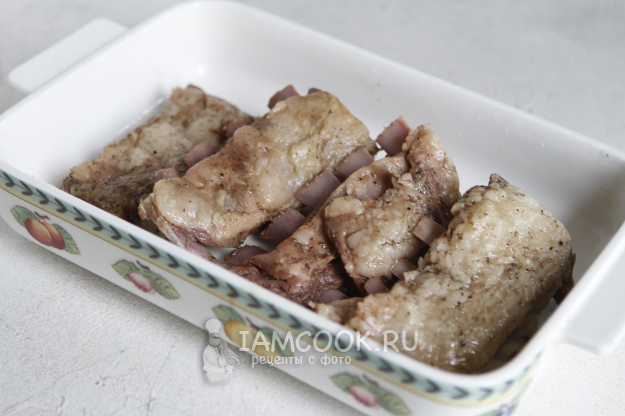 Аккуратно вскройте их и слейте образовавшийся бульон. Мясо достаньте из пакетов и промокните бумажными салфетками. Выложите в форму для запекания.