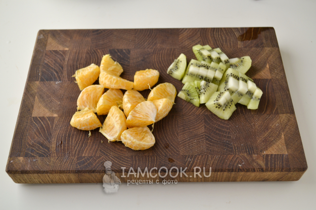 Киви почистите и нарежьте на ломтики. Мандарин очистите, разделите на дольки и нарежьте примерно такими по размеру кусочками как и киви.